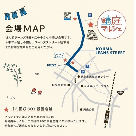 ※駐車場はジーンズストリート無料駐車場、もしくは市営駐車場をご利用下さい。