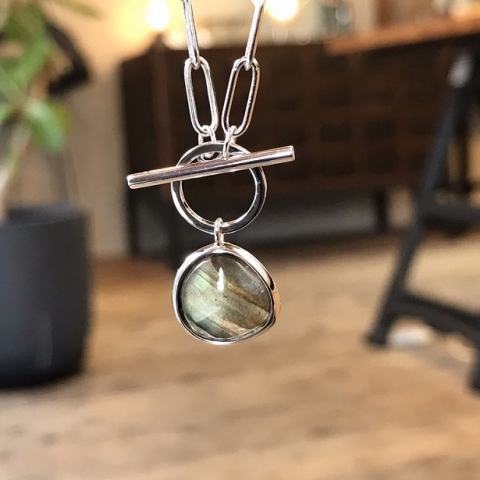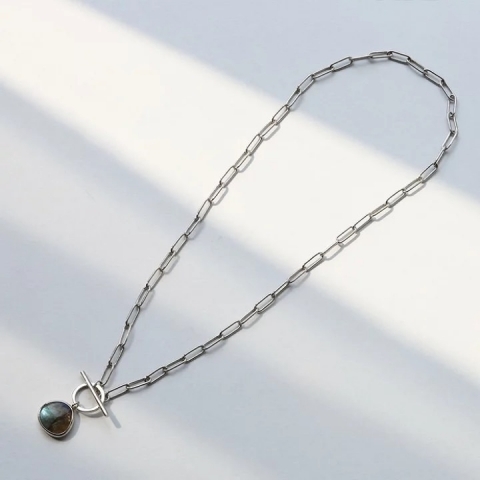 細めのチェーンが女性らしく、光の加減で色の見え方が変わる天然石とのバランスが◎