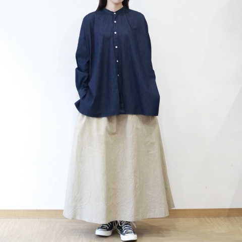 高密度に織りハリ感のある質感ながら、精錬(不純物や汚れなどを除去する工程)、染色に時間をかけ、さらに天日干しで仕上げることで、細かい凹凸のシボ感と深みのある質感が魅力。
