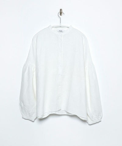 袖のギャザーが特徴のバンドカラーシャツ。