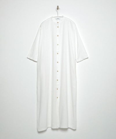 バンドカラーで首元はすっきりと、バックには大きくスリットが入っているから軽やかな印象に。