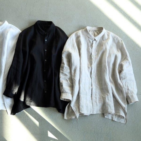 ざっくり着られるワイドなシルエットに小ぶりな襟が可愛らしいリネンシャツ。