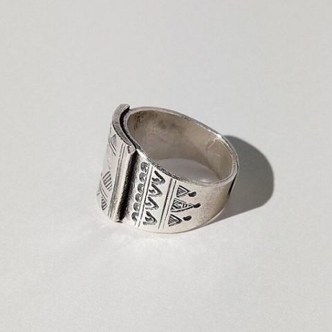 シールド(盾)を思わせる前面の長方形デザインが印象的なカレンシルバーのリングです。