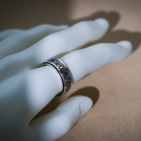 燻しの黒が醸し出す無骨な雰囲気はデニムなどのカジュアルコーデとの親和性も高く、悪目立ちせずこなれ感を出せるリングです。