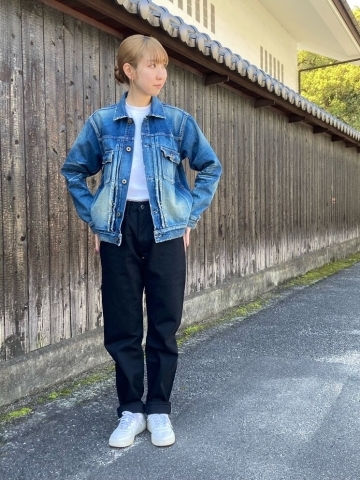 ヴィンテージカラーのデニムジャケットは、ブラックジーンズとの相性も抜群!
