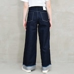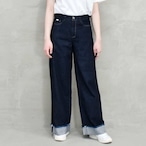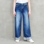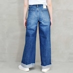 ワイドタイプのデニム。生地を織る際にテンションを緩めに設定したデニムを使用し、柔らかさとシワ防止効果を持たせています。ハイウエストで脚長効果と、ヒップラインが美しく見えるよう、バックシルエットにもこだわりました。