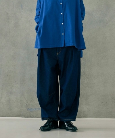 ヒップ回りを大きくとり、裾に向かってテーパードがかかったボリュームのあるワイドシルエット。