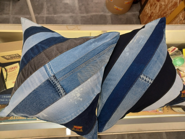 見た目もかっこよく、おいておくだけでデニムの世界観を楽しめるクッションになっております。