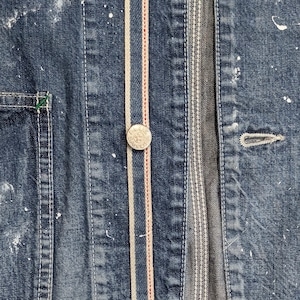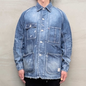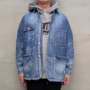 USED加工バージョンでは、熟練の職人が一着ずつ丁寧に仕上げた高度な技術が光ります。ヴィンテージ感を追求した色落ちと、デザイン性を合わせ、味わい深まる色合いに仕上げました。さらに、絶妙なバランスで施されたダメージ加工やペンキ加工がアクセントとなり、他にはない個性と存在感を放つカバーオールです。