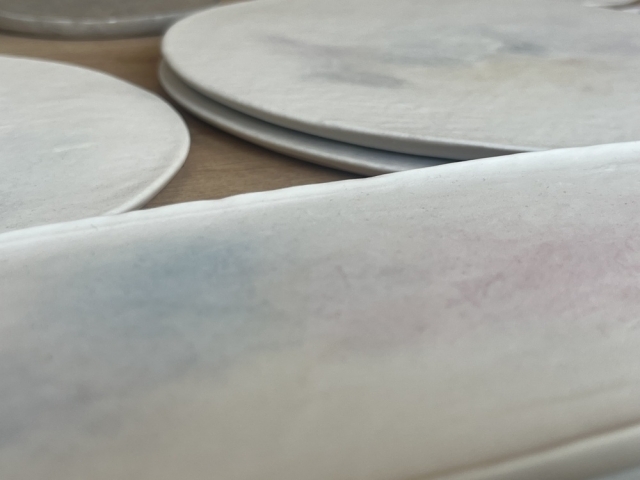 マットな白の釉薬と、素地のもつあたたかな表情。その中にふわりと浮かぶように広がるパステルカラーのにじみが、どの角度から眺めても飽きのこない静かな美しさをたたえています。