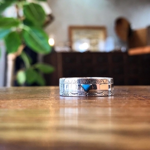 三角形のワンポイントのターコイズがスタイリッシュに映えるリングです。