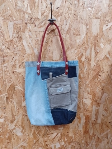 色んな生地でパッチワークされており、持ち手が革になります。