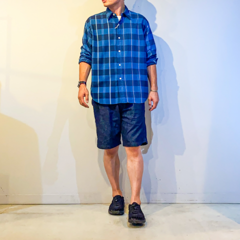 今日は前回紹介した藍染めシャツを使用したスタッフのコーディネートです。
