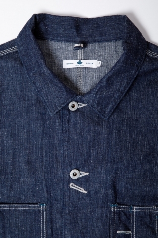 omotodenimのカバーオールは、20世紀初頭の鉄道作業員のワークウェアをモチーフにデザイン。無骨な雰囲気を表現するため、毛羽の多いネップ混デニムを採用しました。使用している11.5ozデニムは軽さと快適な着心地を兼ね備えています。