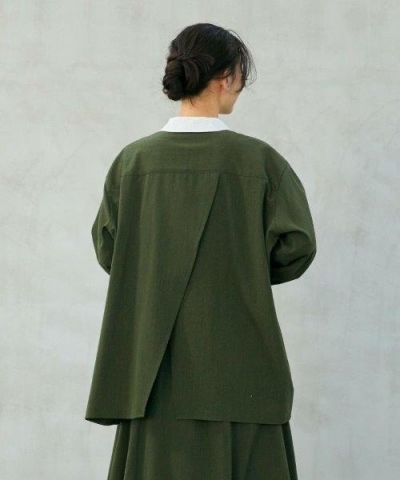背中には大きく斜めにスリットを入れ、後ろ姿も個性あるデザイン。