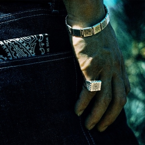 60年代のヴィンテージバンダナから着想を得て製作された、RIVULETシリーズを代表する印台リング。ヴィンテージバンダナの中でもコアな人気を誇るクッキー柄。そのモチーフであるペイズリーや草花を大胆に彫刻しリング全体でクッキー柄バンダナを表現しています。遊び心あふれるポップなデザインは、経年変化によるヴィンテージ感が加わることでさらに魅力を増すよう意図してデザインされています。裏抜きなしで仕上げたシルバー925特有の重厚感と心地よい装着感も魅力。紳士の象徴である印台リングに遊び心を添えた、大人の余裕を映すアクセサリーです。