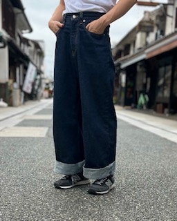 シンプルかつ丈夫で普段使いしやすいワイドなジーンズ。