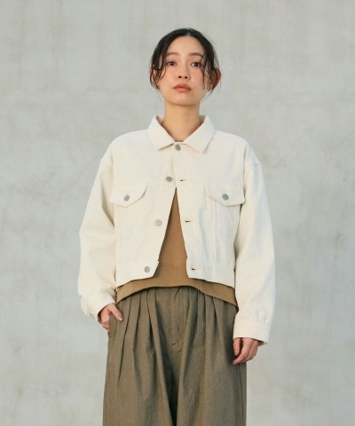 コーデュロイ生地で仕立てた、コンパクトで丸みを帯びたシルエットのジャケット。