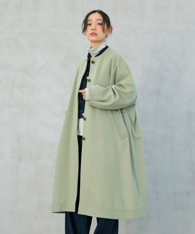 左胸のガンパッチがさりげないアクセントになった、ノーカラーのロングコート。