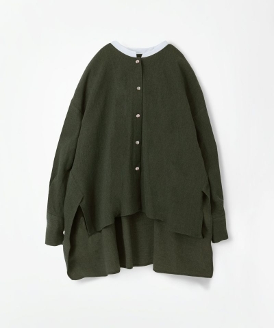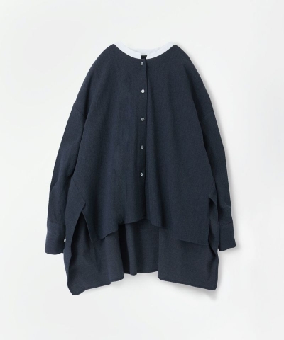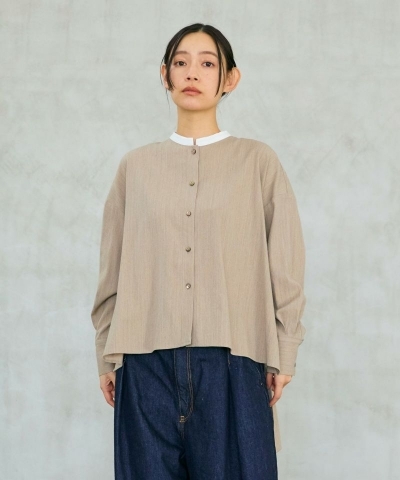 首元のクレリックデザインが印象的なバンドカラーシャツ。