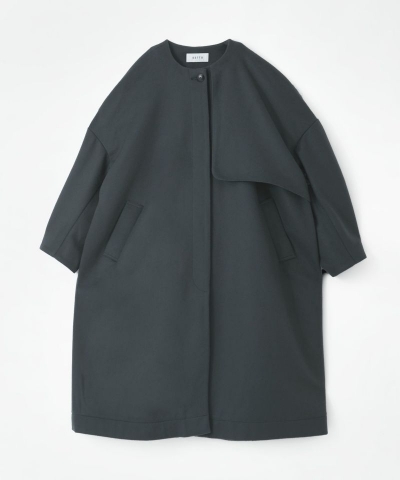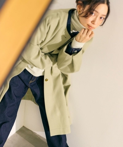 左胸のガンパッチがさりげないアクセントになった、ノーカラーのロングコート。