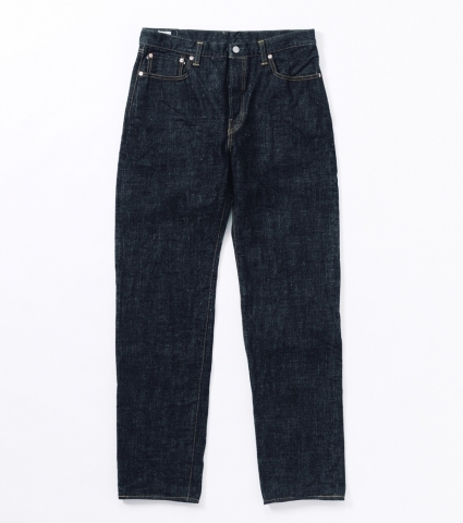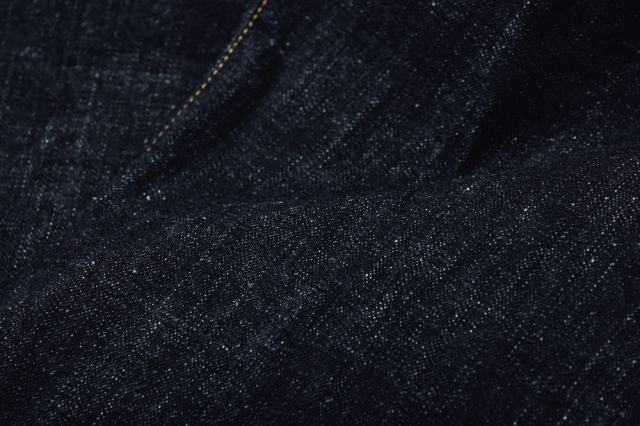 生地には15.5ozのスラブネップデニムを使用。ムラ感のあるロングスラブ糸とネップ糸による表情豊かな生地は、穿き込むほどに縦に落ちるタテ落ちが現れます。黒っぽく見えるまでインディゴを濃く染め上げている為、コントラストのある色落ちも魅力です。